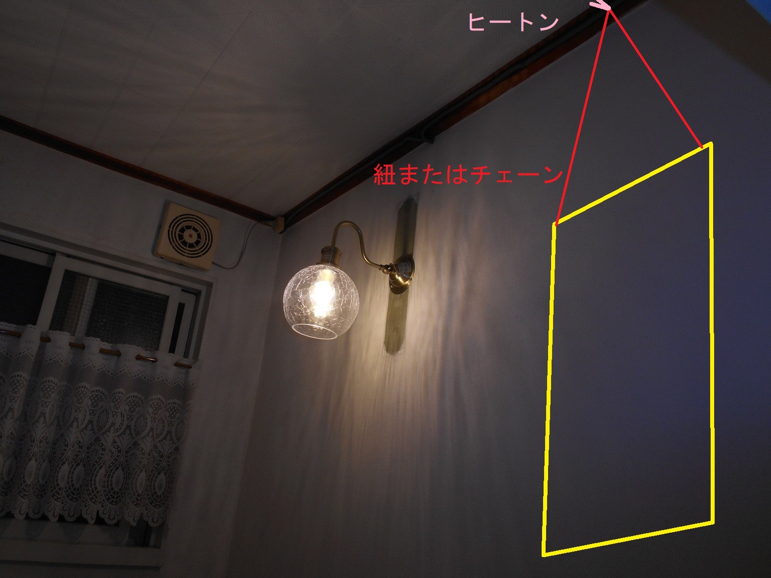 1.天井の廻り縁にヒートンを打って紐やチェーンで吊り下げる